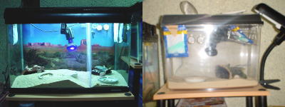 | まずは、安定感のあるところへ水槽を設置しましょう。元来小動物系は上から見下ろされるのを嫌うので、ある程度高さがあった方が良いと思います。自分が生活する目線の位置ぐらいに設置するのが丁度良いです。観察も楽ですし・・・。クーラーやヒーターの風が直接当たるような場所は避けましょう。また窓辺に設置する際は直接日光が当たってケース内の温度異常上昇に気をつけて下さい。あまりガタガタとうるさい所や、常に人が出入りする入り口の側などは避けるべきだと思います。ガタン!とか電気を点灯する際にパチッ、カチッの様な音に敏感な子達も居るようです。 |