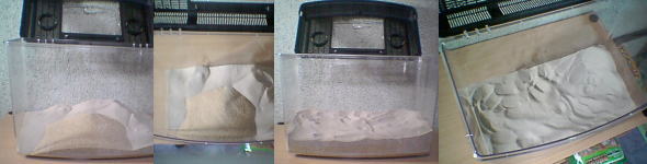 | ケースを置く場所が決まり設置完了したら、砂を敷きます。砂はご自分の好みでブレンドしても面白いです。粒子の細かいものをお選び下さい。ジェルビーは非常に砂堀りが好きであるため、敷き砂には深さが必要です。だいたい5〜6cm程の深さに砂を敷き詰めます。ご自分であらかじめブレンドしたものを入れるのも良いですが、比率だけ考え、後はジェルビー達の砂堀りに任せてみるのも楽しいですよ。また、定期的に交換するという作業も考えられるためあまり高価な砂はオススメしません。砂はあらかじめ滅菌作業を施されたものを使用しましょう。 |