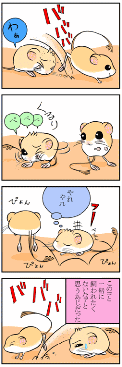 ★ジェルビー達は本当に砂堀りが好きです。誰かがそばで寝てようがお構いなく砂を掘り返し、寝てる子が砂を被ったりして結構笑えます。床材を粒子の細かい砂にするのは定着してきています。砂を掘り返すのは元気の印です^^
