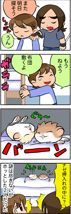 ★この脱走エピソードは、飼育者協会(友の会)の会員の方が実際に体験されて、それをらいたん先生が脚色されたものです。この時はたしか1週間ぐらい経ってから見つかったと思います・・・以外と強い一面を見た気がします。