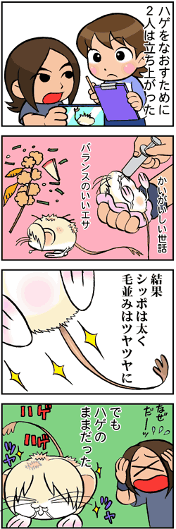 ★ハゲを治そうと思い、あまり躍起してしまうと、逆にそれがストレスになってしまう・・・餌などを見直し長期に渡って治すのが良いと思います。ストレスを掛けるのも、ハゲが出来る原因の一つな気がします。