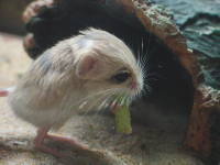 →水分を与えなくて良いとされるジェルボア飼育だが、最近では野菜系の生餌を与える方も増えている。動物専門医の方からのご意見でも、体力の落ちた個体には水分を補給してみて下さいと言う意見も聞かされる。事実、ウサギやハムスターなどで初期の頃水を与えたら死ぬ・・・等と言われていた、現在ではちゃんとウォーターボトルを設置し水を与えているのが普通だ。とは言うものの水を与えて良いのかと言う意見は現在の所、なんとも言えない・・・、ただ、小松菜やキャベツ等を与えている方もいるし、ジェルボア達も個体にもよるようだがちゃんと食べているようだ。管理人もここ最近、小松菜を与えるようにしている、とても美味しそうに食べ人気もある。写真は小松菜を食べている所。 この水分補給に関してはこれからも追っていきたいと思う。 |