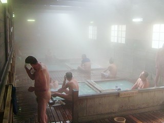 でお湯ですが、強酸性の硫黄泉ですけど、やさしいやわらかなお湯です。 男湯は湯舟が6つ(女湯は4つ?)あり、41・42・43・44・46・48℃とチャレンジングスピリッツをそそる構成となっております。(^_^) せっかくですから、ぜひ48℃にも挑戦してみてください。 ちなみに私は、激熱の湯にはいると足の甲、スネ、手の甲がヒリヒリします。アチチッ。 |