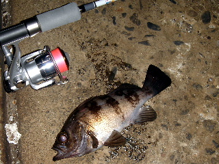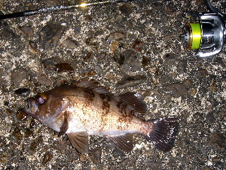 <詳細> 最近暖かいな〜と思い、久々の3連休(2月10日)に三重県にメバル狙いで出撃! 晩飯を道中のコンビニで仕入れ20時過ぎにポイントに到着。早速愛車を路駐して ポイントまで歩く。。。これが意外とめんどくさかった。 まず最初に、マンサーでは有名なプチスロープで第一投!ある程度ジグヘッドが沈ん だのを確認してリトリーブ。 んっっ、なにかアタッたか?と思いすかさず合す。 すると、ゴゴッ、ゴッゴッゴッとロッドがあおられる。2.5ポンドのフロロが海面 に吸い込まれる。なんとか引き上げたら22センチのメバルだった。 ポイントを移しビッグスロープでキャスト。 ここはまだ1回も釣り上げたことが無い。半信半疑でキャストしてリトリーブすると、ジグヘッドが止まった!?しかし、ロッドがあおられん! おかしいと思いさらにリフトしたら、ビィッビィッビィッ〜〜 とドラグが出る。ヤバい!!フロロ2.5lbでかけちまった! と思ったら根に潜られプツッとラインが切れ終わり。 おしい!非常に惜しい事をした。今までボートででかいのを釣った事があったが、 今回の引きは経験がない。逃がした魚はでかい。まさにその通りになってしまった。 気を取り直しプチスロープに戻り20センチのキープサイズとちびスケ数匹を 釣ったころ、急に風が吹く。 時間は22時30分。潮停まりまで約1時間。 スパートをかけるが風が止みそうもないので終了とした。 今回の釣行でいよいよシーズン到来って感じだった。と同時に花粉症シーズン到来で もある。しばらく休止にする予定だ。。。。。。 <タックル> ■ロッド:マンサーメバルプラッキング7.5フィート ■リール:ルビアス2004 ■ライン:月下美人PE0.4号+シーガーグランドマックスFX1.0号 ■ルアー:月下美人ビームフィッシュ1.8インチ <幻影クリアー> ビームスティック2.2インチ ■ヘッド:メバル弾丸2,0g ■ロッド:WIZZ7.2フィート ■リール:フリームス2005 ■ライン:バリバス 2.5LB ■ルアー:月下美人ビームフィッシュ1.8インチ <幻影クリアー> ■ヘッド:メバル弾丸2,0g |