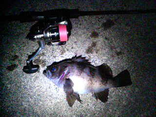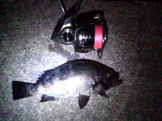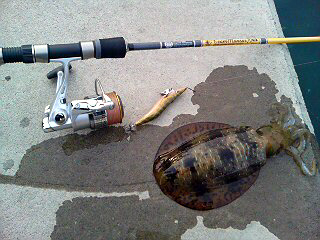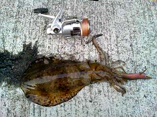 <詳細> なかなか現場に行けず悔しくて、岡本と天野に続き ダイワの高級糸巻機イグジストを「頑張ってる自分にご褒美」とばかりに 気合いで購入。 しかし買ったら当然使いたくなるって事で風の強い悪条件にもかかわらず強行釣行。 何とかなると自分に言い聞かせ、予定通りの5タックル!(下記タックル詳細参照) この道具を釣り場に持って行くことでこの釣りの満足度は 七割程度は達成できている! 現場に2時頃到着し海面を見るとなんとぺたぺたのナギだ。いただきだ! 真っ先にエースポイントに入る。が、反応ナッシング。 首をかしげながら桟橋横でキャスト。 すぐに当たりが有り良い引きをしながら上がって来たのは 23センチのまずまずのサイズ。 ![]() おニューのリールに魂を注入できた。 気を良くし暫く探るがたまに釣れるのは15センチ位のサイズ。 しばらく沈黙のままビッグスロープや最奥手前の港を探るが反応が悪い。 空も徐々に明るくなって来たので、又移動してエースポイントに入り直す。 何投かして待望の当たり。もぞもぞした当たりに巻あわせを入れると 物凄い突っ込みをするが、何とかかわして上がっ来たのは25センチの ナイスプロポーション! ![]() ![]() もうだいぶ空が明るくなってきたので、 ピッチを上げて何投かするが反応がなくなってしまった。 ここでジグに切り替え探る為タックルを交換し対岸の小便おやじポイントへ移動。 早速ジグで探るが当たりなし。ふと見るとコロッケサイズのイカが クルージングしておりジグで誘うと反応している。 これはと思いエギに換えようとしたがエギは車の中に置いてきてしまっている。 走ってエギを取りに行きまだそこにいるイカにアプローチするが 2〜3エギを換えても結局抱きこまず諦めて沖にキャストし底をとり、 ゆっくりジャーク。2ローテ目にグィーンと持って行く当たりに大きく合わ せるが空振り。落ち着いてアクションを付けながら手前に持って来ると、 胴長20センチくらいのがエギを追って来る。足下でステイさせると 躊躇無く抱きこんだ!合わせると同時にヨッシャーと声が出る。 ![]() 久し振りのまともなイカに興奮してしまった。久し振りのイカを ソッコーで〆て次はブイ横を探る。底をとり2ローテ目に入ろうとした時 ビクともしないので根がかりかと思い念のため竿先で聞いてみると、 グイグイ動き出す。柔らかい方のロッドで掛けたので苦労しながらリフトし 浮いて来たのはさっき釣れたのより全然デカイ。抜き上げができず リーダーを持って何とか取り込む。 ![]() ![]() 結局本日最大の胴長24センチ! この1杯で今日は納得の1日になった。 が、欲をかいて釣り続けると秋イカの様にグイグイ持って行く当たりが続き、 この後も胴長20センチを2杯、他10杯程追加し大満足のまま ストップフィッシングにした。 ![]() ![]() 帰りは地震の影響で高速が通行止め、 その影響で下道を途中3回ぐらい意識を失いながら 5時間かけて帰りましたとさ(泣) <タックル> メバル.A ■ロッド:フィネッツァ732ULS ■リール:イグジスト2500 ■ライン:月下美人PE0.4号+フロロ0.8号 ■ルアー:ビームスティック2.2インチ+コブラ1.4g メバル.B ■ロッド:エアライツ682S ■リール:ルビアス2004 ■ライン:フロロ3Lb ■ルアー:スクリューテール+ジグヘッド コブラ1g メバル.C ■ロッド:エアライツ 722SL ■リール:カルディアKIX2004 ■ライン:月下美人PE0.4号+フロロ0.8号 ■ルアー:プライアルジグ5g イカ.A ■ロッド:カラマレッティ892H ■リール:エメラルダス2506 ■ライン:ライン PE0.8号+シーガーフロロ2号 ■エ ギ:エギ王Q3.5号 イカ.B ■ロッド:マンサージグ&スクイッド702ML ■リール:ルビアス2506 ■ライン:PE0.8号+シーガーフロロ2号 ■エ ギ:エギ王Q 2.5号