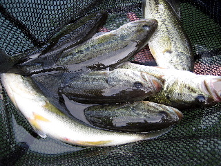 <詳細> 新規開拓。 フロンティアスピリッツに満ち溢れた、前向きで魅力的な言葉だ。 しかし、その実像は実に地味で、地図を頼りにやっとたどり着いても、 釣り禁止だったり、水がなかったりする。 仮に無事フローターが出せても、ほとんどの場合が“微妙にスカ”に終わる。 精神的にまいることも多い。 しかし、この作業をしなければ、釣りはただのルーティーンワークとなってしまい、 技術もタックルも進化しないし、なにより飽きてしまう。 そんなにたくさん釣りに行けないマンサーメンバーのためにも、 まだ見ぬパラダイスを求めて、高速道路を東奔西走するのだ。 そんなシリアスな開拓作業だが、今回はかなりうまくいった。 今回新規で廻った池は、6ケ所だが、そのうち2ケ所を NEWマンサーポンドとして認定できた。 実際、いろんな諸事情で、フローターを出せたのはこの2ケ所だけだったので、 打率的にはかぎりなく10割に近い。 とても有意義な釣行となった。 まずは朝いちで向かった少し大きめの池。 ネットで下調べした感じでは、バスを釣ってる人はいる模様だが、はたして “おおぴら”にやっていいものかどうかは、現地で確認しなければ分からない。 近くの駐車場に停めて、しばし歩くとデカイ堰堤が見えてきた。 ご覧のとおりすばらしいロケーションなのだが、 残念なことに釣り禁止のカンバンが設置してあり、 泣く泣く車へ帰り、次の池へ向かった。 2ケ所目はうって変わって、絵にかいたような、野池らしい野池だ。 水質も濁り気味でお世辞にもイイとは言えず、フローターを出すのをためらった。 しかし、せっかく遠いところを来たのだ、ダメならスグに次だと言う事にして 朝もやが水面を漂うなか、本日初テイクオフ。 しかし、ダメもとでやったこの池だが、思いのほか良い結果となる。 ジュンちゃんのこのファーストフィッシュを皮切りに、コンスタントに釣れ続く。 ほとんどがクランクベイトでのキャッチで、 ジュンちゃんがもっとも得意とするメソッドだ。 池に陽が差し込むまでフライでのバイトがなかなか無かったが、池に太陽の光が 差し込みだしたあたりから、フライにも連続バイトが続く。 水質がかなりマッディーなので、実際フライにバイトするまでサカナはまったく 見えないが、そこがまた楽しかったりする。 岸ギリギリの草が覆いかぶさっているところへの、 ひっかかる寸前のきわどいプレゼンテーションが要求されるが、 キャストがきまればこのとうり。 素直に出てくれる。 あと、水質なのか時期なのか分からないが、バイトのしかたが異常に地味だ。 もともとかなりナチュラルに出るこのフライだが、 チビギルの様な、ごくごく小さな波紋しか出さないものが多かった。 結局この池で、オレが4キャッチ、ジュンちゃんが6キャッチする。 小さな池なので、1時間半ほどで終了して、近くにある池を見に行く。 あ、この池は「池らしい池」と命名する。 しかし、このあとロケーションの問題や、釣り禁止などで 3ケ所連続で釣りを見送ることになる。 唯一キャッチしたのは、“狙って”釣ったジュンちゃんのコレ。 これほどまでに立派なヤツは久しぶりに見た。 この大きさになるのに、いったい何年かかるのか。。。 しかも、この池はコノクラスのがたくさんいて、 カエルファンにはたまらない池だろう。 さて、そろそろ気力も体力も1回目の“谷”にさしかかってきたところで、 池までの道のりが、すこしハード目なポイントへ到着する。 クルマを停めたところから結構歩かなくてはならず、 歩いて下調べをしにいったものの、もう一度この道のりを、 決して軽く無いフローターを担いでくるのかと思うと、ためらった。 しかも、前日の雨がかなり影響しているらしく、水質も濁り気味だ。 はたしてこんなところにバスが入っているのか? お互いしばらく池を見つめていると、堰堤の付近に小さい影が。 チビバスです。 数匹のチビが、あきらかにエモノを物色しながら回遊しております。 これで一気にテンションが上がり、足早にクルマへ戻り、準備をする。 すこしエントリーしにくかったが、なんとか無事に入水完了。 この池は、砂防堤でせき止められたところに水がたまったところで、 「ダムっぽいところ」と命名。 本来はもっと水質がよさそうだ。 左岸と右岸に分かれて釣り進むと、ジュンちゃんにすぐ反応がある。 得意のクランクでの一匹。 とりあえずホッと一安心だ。 フライにもすぐに反応があり、そのあともお互い釣れ続く。 サイズ的には不満があるが、まったくスレていない美しいプロポーションの バスを釣るのはきもちよい。 この池では、お互い10を楽々越えた数をキャッチする。 このあと、琵琶湖に行ってみるも、 こんなんや、 こんなのしか釣れず。 最後のシメでいつもお馴染み「YOUダム」へ行く事に。 で、さすが抜群の安定感を見せつけます。 一日のシメにふさわしい結果でした。 先行者が居たこともあり、いつもと