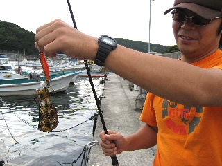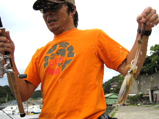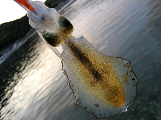 <詳細> ひっっっっっさしぶりの海だ。 今年は早いうちからバスに入れ込んでたので、 道具もココロもスカスカに塩抜きされてしまっている。 例年ならばそろそろ海の準備をするところだが、すっかりバスづいてしまい、 “こりゃ10月までバスかな”と思ってた矢先、 “マンサーいちの耳年増”と名高いミズノ宝飾からの情報が入った。 家族旅行のついでに様子を見てきて、今年はイカの調子が良さそうとのこと。 詳細を聞くにつれ、眠っていたウミンチュのタマシイが目覚めてきた。 やべぇ、、、が然やる気モードだ。。。 ってなワケで、タックルまで新調してのトライになった。 時季的にちょいと早いが、様子見がてらってことで。 今回のパートナーは、ダッジシマオカことシマだ。 仕事がギリギリまでかかってしまい、出発予定時間まで3時間しかない。 寝たら100パー起きれん。。。 仕事が終わったところで、テンションが高いうちに出発。 向こうで寝ればいいや。 2時間ほど熟睡したところで、ガボガボガボっといつもの邪悪なサウンドが 聞こえてきた。 シマも早めに出発したようで、少し早く到着。 眠いので少し寝るそうだ。 オレは目が醒めてしまったので、水銀灯のあるポイントで少しやることに。 上げの真っ最中で、ものすごい勢いで水が動いている。 水の色もきれいで、なんだかイキナリ釣れちゃいそういだ。 よそうどおり、ワンキャスト目からエギをチェイスしてくる。 しかし、流れが早いのと、水銀灯がついているとはいえ、さすがに夜なので暗く、 うまくホールドさせられない。。。 結局、3ハイほどにスミを吐かせておしまい。 明るくなってきたので、シマを叩き起こして本番開始。 とりあえず、ミズノの情報を元に、三重漁連前から始める。 がしかし、聞いていて状況には程遠く、チビのチェイスすらない。 夜にくらべて、若干水が濁ってきているのが影響しているのか? 順番に釣り進みながら、オッサン放尿ポイントまできた。 この時点ですでに小一時間やっているが、まだイカの姿は見ていない。 ココで姿が見れんと、かなりキビシイところである。 表層を幅の広いダートで誘うが、浮いてこない。。。 ならばと、ボトム付近まで沈めて、タテ方向での誘いに切り変えてみる。 着底から6回ほどジャークをかけて、長いフォールでホールドを誘発させる。 2ローテーション目のフォールし始め、まだまだ着底には間があるのに、 ラインにたるみが出来た。 一呼吸おいて、ビシっと合わせる。 激チビですが、ようやくきました。 同じような釣り方で、シマもヒットさせる。 こちらも同じく激チビです。。。 2.5寸のエギとさほど大きさがかわりません(泣) このポイントではこの2ハイだけで、さらに奥のシャローエリアへ しかし、おなじくらいのを数杯拾っただけで、パッとしない。 ハラも減ったので、一旦クルマへもどり休憩する。 で、今回もってきてるタックル。 カラマレッティ2本と、デスペラード、そしてマンサーオリジナル。 手前から2本目のカラマが本日初おろしの逸品。 シリーズ中もっとも柔らかいとのことだが、想像以上にしっかりしており、 正直、もーちょい柔らかくてもイイかな?と思うところである。 とはいえ、非常に使いやすい竿で、軽さについては特筆すべきものがあり、 現在最軽量のイグジスト2506との組み合わせは、バスロッド級の軽快感だ。 とりあえず、タマシイは注入したが、せめてキープサイズはかけたいところである。 休憩もおわり、第2ラウンド開始。 ビッグスロープエリアへ向かう。 いつもの漁師のおじさんにあいさつをして、船の間を攻める。 しばらくするとシマにヒット。 これまた小さいが、さっきのよりはいくぶんマシだ。 一応写真におさめようと、シャッターを切った瞬間! 最後のひと絞りを浴びせかけられる。 幸い、“タマ切れ”だったようで、大事には至らずやれやれだ。 しかし、小さいうえにシブい。。。 この周辺でも、数杯釣っているのだが、いずれもキープサイズには程遠い。 クルマで少し移動して、港の外側のエリアへやってきた。 先行者がいたが、あまり“やってなさそう”なんで、 気にせず空いているスペースに入らせてもらう。 すると、1キャスト目からチェイスがあり、 ジャークのあとの“フリードリフト”でガッチリホールド。 なんとかキープサイズを捕獲した。 同じくシマもキープサイズを捕獲。 ところで今日は、エギにやたらとメッキがチェイスしてくる。 しかも、かなりの高確率だ。 たまに、エギにガツンとアタックまでしてくる。 三重のこのエリアはもともとメッキが多いところなので、 そんなこともあろうかと、いつもポッパーを少し持ってきているのだ。 早速やってみると、ものすごい勢いでチェイスしてくる。 しかし、なかなかバイトまで持ち込めず、手こずりまくって、 ようやくこの一匹をヒットさせた。 こんなんも釣れた。 ダッツンだ。 あいかわらずボディーにグルグル巻きにし