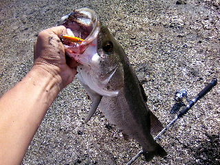 <詳細> 「祝日」というのは、基本的に、僕には関係無く、いつもなら出勤なのだが、 今回は珍しく休みだった。 そんな貴重な、この3連休の最終日。どこへ釣りに行こうか… 福井県のハマチは、2日前に行ったばかりなのでイマイチのらない。 三重県のメッキ&アオリイカは不調の報せが。 となると養老のバスというのも悪くないが、 ふと、「潮時表」を見た時に僕のハラは決まった。 「三重県で白昼のトップシーバス」。 これだ。 何故「潮時表」なのかと言うと、 潮位がかなり低くなる時の「流れ」によって、 シーバスの活性が一時的に異常なまでに上がり、 真っ昼間からトップでバンバン出まくる時があるのだ。 もちろん、どこでも良いって訳ではない。 今回のポイントは、マンサー内でも、まだ僕と岡本君しか知らない、 激シークレットポイントなのだ。 別に隠していた訳ではないが、なんせ今のところ9月〜10月の期間で、 しかも、潮位がかなり下がる日にしかまともな結果の出ていない、 「期間限定」「状況限定」で、そしてさらに、恐らく、いざ現場に着いたら 「…は?…」 と、なるような超プチピンスポットなのだ。 それでも釣れれば良いが、貴重な休日に、 数ある釣り場の中からここを選んでハズした時は相当なショックが 待ち受けているだろう。全くフォローが効かないのだ。 それこそ、ゴカイでも買ってハゼでも釣るか、 イオンでお買い物でもするしかないだろう。 が、そんなポイントだからこそ、良い日に当たれば、 余所の釣り場とはひと味違った 「してやったり!」 が味わえるのだ。 そして釣り場に到着。 干潮潮止まりの1時間30分程前だが、すでにはっきりした流れが出来ている。 なんせ「時間限定」なので、そそくさとキャスト開始。 ピンなポイントの、さらに「エース・ピンスポット」へ打ち込む。 が、出ず。 まだ魚が散っているのか? ならば、と、沖目の開けた所にキャスト。 全体的に激浅い釣り場なのだが、僅かながらも流れが 作り出す地形変化があるのだろう。 狭い範囲で、集中してバイト!バイト!しかしなかなかノらない。 シーバスってヤツは相変わらずノらんな〜… と、思っているとようやくヒット! まぁ、小型だが、トップへの激しいアタックを堪能させてくれた気持ち良い一本。 ヒットルアーは「デュエル・エバポッパー」。 2年前はこれで、沢山のシーバスを釣らせてもらったが、今日はそれほどでも無く、 続かないので「ティムコ・レッドペッパーマイクロ」をチョイス。 セコいっ!と、言われそうだが、とにかく、どシャローで、遠投の必要も無く、 基本的にピンを撃つので、余計なアピールはアダになる可能性が高いと思われる。 しかし、この「レッドペッパーシリーズ」はさすがだ。 意外と小ウルサい、チームマンサーちんぽこ軍団に 「代わりの無い存在」 と、言わせるだけの事はある。 相変わらずノらないが、バイトは多い。 そして、次は、かなり濁っているのに、 うっすらとボトムが見えるまで潮位が下がった 「エース・ピンスポット2」へキャスト。 チャッ!チャッ!と動かしていると 「ゴッボォッ!」 と、これまでとはスケールの違う捕食音が! しかし、 「あ゛ぁ〜…」 ノらず。 ワンモアチャンス!とキャスト。チャッ!チャッ!… し〜ん…。 「2度目は無いか…」 が、簡単に諦められるハズもない。 また撃ち直す。すると 「ゴッボォッ!」 さっきと同レベルの大音量!今度はノった!ヒット! 真っ昼間のどシャローなので魚体が丸見えだ! ドドッ!と緊張感が押し寄せる!デカい!このポイントでは、 まさかの想定外サイズ! 「ジィィ〜ジィィ〜…」 フックがショボいのでムリは出来ない。 「ガバガバッ!」 ほのぼのするような、のどかな風景に似合わない、激しいエラアライ! 目の前で繰り広げられる光景に違和感すらおぼえるが、 そんなのお構いなしに、ヤツは暴れまくる! 「もお、やぁめてぇ〜!」 まるでオ●ム真理教の弁護士だ。 2日前の「ワインドハマチ」での筋肉痛が残る、僕の右腕を好き放題にもてあそぶ! 「パームス・サーフスター70SL」は良い仕事をしてくれているが、 なんせヤツもタフだ。寄せては走られ、寄せては走られを繰り返す。 本来、釣り人としては喜ぶべきナイスファイトのはずだが、 どうしてもシーバスという魚の「バレ易さ」が頭を巡る。 気持ちに余裕は全く無い。今日の祝日が、文字通り「祝日」になるか、 ヘコまされて「縮日」になるかの瀬戸際! が、さすがにヤツもヘバってきた。 見たところフックは2つともしっかり掛かっているようだ。 ここぞ!とばかりに、引き寄せ、遠浅の地形を利用して、岸へ頭部をズリ上げ、 速攻でハンドランディング! 「ハッピーホリデ〜」64cm! にわかシーバサーの僕には上出来サイズだ。 てか、何げに自己記録。まさにしてやったり! その後は小型ばかりだったが、潮が止まるまで、 トップへの刺激的なバイトが味わえた。 オマケにミノーでバスも釣れちゃったし。 ヤルぅ〜! 帰り道、「Co