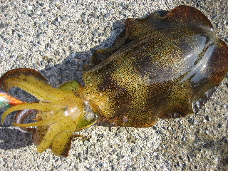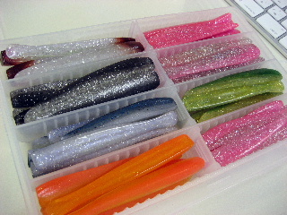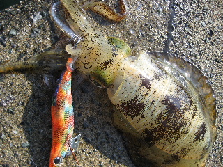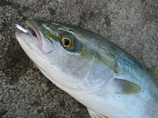 <詳細> 我々は、毎年その年の流行があるのだが、今年秋の流行はずばり、 オカッパリのハマチゲームだ。 以前から存在は把握していたのだが、前回の釣行でようやくヒットまで持ち込めた。 ワインドを取入れたことにより、一気にレギュラー入りの雰囲気だ。 しかし、まだまだ分からないことの多いこの釣り。 雑誌やインターネットの情報では分からない、現場からのフィードバックを求めて、 今週も福井県にやってきた。 本日は他のメンバーと都合が合わずピンでのトリップ、そして昼までの時間制限付だ。 少し暗い内に第一エースポイントへポジショニングする。 まだ暗いが、水銀灯が水面の一部を照らしていて、 良く見ると、水面にいる小魚の周囲に30センチほどの魚がウロウロしている。 肩ならしに、ペンシルベイトから順番にレンジを落としながら、様子を見ると、 ビーフリーズ65Sのジャークに激しく反応を見せた。 なんどもアタックを繰り返し、やっとフッキング! エギングロッドでやっているので、合わせた衝撃で水面に跳ね上げてしまい。 そっこーでフックアウト。。。 チラっと見えた姿は、カマス。 オカッパリで釣れるサイズとしてはまずまずのサイズであったが、 残念ながらそのあと姿を見せることはなかった。。。 その後、ナイトエギングや、ナイトワインドを試すが、反応ナシ。 そうこうしてるうちに、東の空がうっすら明るくなってきた。 ここは今もキチンと機能している漁港なので、この時間は漁船の出入りが激しく、 釣りが困難になる。 手返しの軽いルアーマンはまだマシだが、エサ師は自然とこの時間帯は手薄になる。 プロフィッシャーマン達の出勤を見守り、落ち着いたところで本格的にキャスティング開始。 今回2度目のトライだが、タックルは前回と比べて別段変わったところはない。 基本的には、ドリフトアックス12gとマナティー90の組み合わせだ。 強いて言えば、マナティーのカラバリエーションが増えたくらいか。 あと、フックをワンサイズ落としている。 (#2から#3) これは、釣れるサイズに合わせたつもりだが、 どういう風に影響するかまったく分からない。 一応、従来のフックも持込んである。 漁船の往来が一段落して、静かになった海に、 とりあえずトップをフルキャストする。 ナブラなどはないが、活性が高ければ、そこそこ水深があっても、 浮き上がってくるはずだ。 しかし、ペンシルベイト、ポッパー、シンキングペンシルと投げまくるが、 反応はナシ。。。 ま、やってればそのうちトップでも釣れるだろう。 本命のワインドに切り替える。 朝マズメということもあり、オレンジカラーを選択。 ナブラもなく静まり返った海へフルキャストする。 しかし、カラマレッティプロトタイプ86MHと、ワインドのマッチングはサイコーだ。 ハイモデュラスだが、ある程度フレックスするカーブデザインが、 高弾性マテリアル独特のデリケートさをうまく和らげ、 キャスティング時のパワーレンジを広くしてくれている。 一つ下のグレードの普通(?)カラマレッティの、 同じく86MH(すでにオフ済)も所有していたが、 こちらはツボにはまるとものすごい勢いでラインを引っ張り出すのだが、 タイミングがズレると”棒投げ”状態になってしまうことが多かった。 しかし、色々な理由があって、微妙にいらなくなっていたプロト86MHだが、 こんな形で活躍するとは思わなかった。 オフらなくてよかった。。。(笑) さて、4〜5投してもチェイスがないため、カラーを定番のピンクに変える。 6分ほどの力で、10メートルほど先のブレイクにキャスト。 1秒に2回ジャークのリズムでテンポよくアクションさせてくる。 カラーチェンジして数投目、ブレイク付近に差し掛かった時、 ジャーク中のロッドがガツンと止まる! ヒット! そんなにデカそうではないが、青物特有のスピード感のある引きを楽しませてくれる。 やり取りを楽しんでネットインしたのは、35センチくらいのハマチ。 なんと、マナティー90丸のみです(汗) 写真ではヘッドの先端がチラっと見えてますが、ランディングした際は 完全に口の中にinしてました。。。 あと、オフショアで釣ってた時は、下アゴを掴むことなんてなかったのだけど、 ハマチって意外と細かい歯があるのだね。 バス持ちしていたら、親指の付け根がザラザラになっていた。 こりゃ、リーダーの太さ、考え直したほうがよさそうだ。 現在、2.5号〜3.0号のフロロを使用しているが、 3.5号〜4.0号に上げたほうが、後悔はなさそうだ。 結局、このポイントではハマチ1匹に終わり、時間もそんなにないので、 さっさとポイントを先に進める。 目的地は、前回ジュン氏が好調だったエリアだ。 途中、カサゴ牧場をチェックするも、子フグが異常発生していて、 油断していると、マナティーをボコボコにむしり取られる。。。 しかも、エサ師のコマセに慣れているのか、 人が近付くとどこからともなく大量に涌いてきて、ちょっと寒気がする。