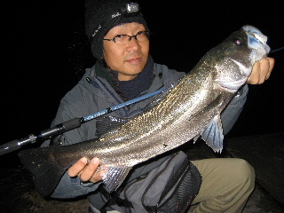 <詳細> 最近マンサーで流行りの兆しを見せている、シーバスをやりに福井県にきている。 シーズンインしたとみうけられるメバルの調査もかねてのトリップだ。 今回はカッシーも参加していて、オレ+ジュン+カッシーという珍しい面子。 とりあえず、メバルとシーバスの複合ポイントへいくも、なにもおこらず移動。 その後、奥湾部へ移動して、チビメバルとチビヒラメをわたくしが、 激チビメバルをジュン氏が釣るも、特にコレといったこともおこらず、さらに移動。 本日のエースポイントの一つでもある、ウグイ港へ到着。 「ココはかたいでさ」とまだノーフィッシュのカッシーに言って始めるも、 こーゆーこと言うときにかぎって、まったくのノーフィッシュ。 こりゃ、マズい展開だ。 早めに見切って、さらに先のポイントへクルマを走らせる。 ココは結構有名なポイントで、エサ師やらルアーマンやらで、いつもそこそこ人が居るところだ。 本日もやはり先行者が2組ほどいらっしゃって、ルアーやら電気ウキやらを投げている。 空いているところに入り、キャストを始めるが、どうも反応がない。。。 ウロウロしながら、ルアーを投げていると、わたくしに待望のヒット! ビーフリーズ65SのCVカスタムカラー、ピックアップ寸前の足元でグリンと反転しながらバイトした。 久々の生命感を楽しみながら上がったのは、35センチほどのシーバスだった。 ちょいとやせ気味だったが、カッシー家のタンパク源になってもらうべく〆る。 となりでやっていたカッシーにもアタリがあったようで、ちょっと活性が上がってきているのかも。 しばらくして、少し離れたところでやっていたジュン氏から、「キタよ〜!」と声がする。 「ちょっとイイサイズだで、ネットたのむ」と言われ、クルマへネットをとりにいき、駆け付ける。 カッシーも来ていて、水面を覗き込むと、オオ〜!いい型じゃん! フックの掛りどころが、かなりヤバめだったので、慎重かつスピーディーにランディング。 ちょいと細めの65cmでした。 ナモト70LLが、バットまでブチまがって楽しかったそうです。 これもカッシー家のために昇天してもらう。 この魚でいっきにやる気モードになるも、その後まったくダメ。 ちかくのメバルポイントへいってみるも、これまたダメ。 ダメダメずくしで、朝になり、みんなで仮眠。 その後、来たポイントを帰りながらやってみる。 ついにウグイ港まできてしまい、ラストポイントだ。 しかし、ダメモトでやったここが、おもいのほか好反応で、ヒットは少なかったが、 ミノーやバイブレーションにチェイスするセイゴやそこそこサイズのシーバスが丸見えだ。 結局、このポイントでは、35cmくらいのと、40cmくらいのをわたくしが釣って終了。 ジュン氏はバラシが多く、悔しがっていた。 あと、終始ノーフィッシュで終わったカッシーだったが、 もらったものとはいえ、お土産は確保してプラマイゼロな感じだ。 やっぱ、折からの降雪が、一気に海水温度をさげたのが 低活性の原因じゃなかろうかと思われる。 途中の高速や、市街地の道ばたに雪が山積みになってたからね。 そうとう降ったのだろう。 リアルボーダーのカッシーなぞは、道ばたのその雪をみて、 「あれくらいあったら“やれます”ヨ!」とテンションが妙な感じになってた。 カッシーはこれからシーズンインだが、 我々はしばらく、不安定な時期に入る。 思わぬシーバスフィーバーになっているが、 シーバスも含めた、複合ターゲットでこの冬を乗り切りたいものだ。 <タックル> OKAMOTO ■ロッド:TeamMANSARオリジナル732UL ■リール:イグジスト2506 ■ライン:バリバス ライトゲーム<0.4号> ■リーダー:シーガーグランドマックス 1.7号 ■ルアー:ビーフリーズ65S ++++++++++++++++++++++++++++++++++++++++++++++++ JUN ■ロッド:ナモト70LLS ■リール:ステラAR2500 ■ライン:レグロントーナメント8lb+グランドマックス2・5号 ■ルアー:ビーフリーズ65S ++++++++++++++++++++++++++++++++++++++++++++++++ KASSY ■ロッド:WIZZ 662UL ■リール:フリームス2005 ■ライン:バリバストラウトアドバンスフロロ<2.5lb> ■ルアー:ラパラ