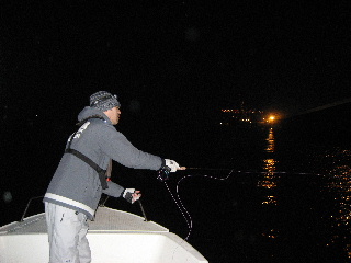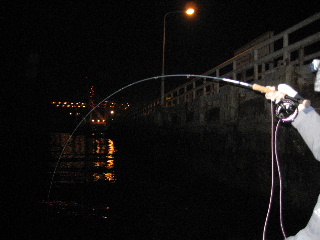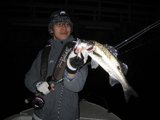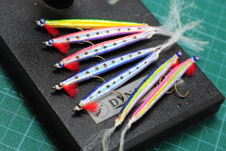 <詳細> マイブーム。 フライで狙うシーバスが熱い。 我らが名古屋港では、なぜかイマイチやる人が少ないのだが、 関東の方ではかなり流行っていて、専用のチャーターボートまである。 その中でも、今もっとも熱いのが、いわゆるイワイミノーを用いた、ドライ(トップ)での釣りだ。 #5〜#7の、ソルトとしては比較的ライトなタックルに、フローティングラインの組み合わせで、 軽快に釣っていくこの釣りは、重いシンキングラインが主流だったこの分野に、 革命を起こしたと言っても過言ではないだろう。 バスに対しては、2年ほどやりこんでおり、タイイングも、メソッドもある程度身に着いてきた。 しかし、シーバスに対して使うのは、まだ数回だ。 そもそも、シーバス自体をそんなに釣ったことない上に、名古屋港でのこの釣りのデータが、 ほとんど無いときてる。 おまけに、なまじバスでの経験があるため、そちらのイメージが先攻してしまい、邪魔をする。 しかし、前回の釣行でかなりのデータがとれたため、一気に加速する。 まずは、リーダー。 ![]() 前回は3Xのフロロカーボンを使用したが、もう一つ太くしてもよいだろうってことで、2Xへ。 太くなれば、当然ターンしやすくなり、キャストは楽になる。 しかし、魚に対しどう影響するかどうか。 次はフライ。 肝心かなめの部分で、この釣りのすべてを握っている。 前回は、バス用のものを、カラーだけソルト用にしたものを、あえて使ってみた。 その時のシーバスの反応を見てキャプテンが、もっと太く大きくしたほうが良いだろうと、 意見を言ってくれた。 もっと見つけやすくしてやる、と言うことだ。 その辺のファクターを取り入れてタイイングしたのが、とりあえずこれ。 ![]() 今までのバス用とくらべると、ずいぶん違うのが分かるとおもう。 シェイプを、イワシなどのベイトにあわせ、体高をもたせ、 長さは、現在名古屋港内でよく見られる70mmに設定。 ギルとテールもボリュームアップした。 大きくなったぶんだけ、造型に自由度ができたので、インナーをベイトっぽいシルエットにし、 テール部分を削りあげて、ダウンフォースを生み出すようにした。 初期ダイブのレスポンスと、ストローク中の安定を狙ったものだが、あくまで机上の空論、 実際使ってみるまで、なんとも分からない。 この仕様で、結構な本数を巻いてしまったが、ここまで大幅に仕様変更するのはしたことが ないため、正直かなり不安だ。 これが全部ゴミになるのは避けたいが。。。 フックも変更している。 ![]() 全体的に太くなり、浮力が強くなっているとおもうので、 2500V-SEから、TMC777SPへ銘柄を変えてみる。 ソルトウォーター用に開発されたフックなので、シャンクが太く、ポイントのカットもエグい。 これも始めて使うので、重すぎたらどうしよう??ちゃんと泳ぐのか。。。? ま、なにごとも現場でやってみんとなにも始まらんし、ダメならダメで、また次の手を打つさ。 しかし、フライフィッシングは、この作業がたまらんな〜。 さて、これだけ準備すればとうぜん行きたくなる(笑) しかし、今現在この釣りやってるのは、メンバーでオレ一人だけ。 しかも、平日に行くとなるとさらに皆無。 しかたない、一人でチャーターするか。。。 前回と同じく、小川キャプテンに電話し、予約する。 オレ一人だけと言うこともあり、少し明るいうちから出船することにしてもらう。 で、今回持ち込んだタックル。 前回同様、ルーミスのGLX#6と マンサーオリジナルの9ft5#、いつもバスに使っているものだ。 #5で、どの程度の大きさのフライがキャストできるか試してみたい。 退路を断ち切るため、ルアータックルは一本も持ち込んでいない。 出航したが、風が予想以上に強い。 昼からの天気予報は、時間を追うごとに下方修正されていき、 最終的には8mくらい吹くことになっていた。。。 小川キャプテンが行く予定だったポイントへはほとんど入れず、内湾のタンカー回りなどを やるが、まったく反応は無い。 この辺のポイントは、夜にならないと上ずらないようで、フライにはまったく出てこない。 しかし、キャプテンがルアーでやると、あっさり釣れるので、魚がいることは間違いなさそうだ。 しかたがない、暗くなるまで、少し時間があるので、キャスティングの練習と、 ミノーのスイムチェックをする。 このフライ、形こそシンプルだが、バランスをとるのが意外と難しく、ダイブしにくかったり、 スイミング中に横を向いてしまう、または、左右にふらふらと安定しないなどの症状が出る。 一定の水深を、スゥ〜っと真直ぐ泳いでくるのがベストだと思う。 今回大幅に仕様変更したので、かなり不安だったが、予想以上に良い出来のようだ。 『これくらいが、ルアーでやる場合のマックスのスピードです』と言う早さで ボートで引っ張ってみたが、まったくブレずに一定の水深を泳いでくれる。 『良さそうですね』とキャプテンから御墨付きをも