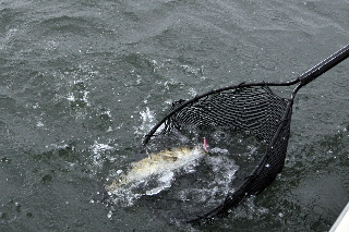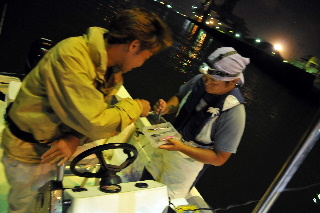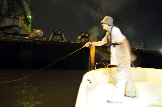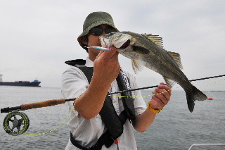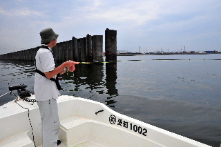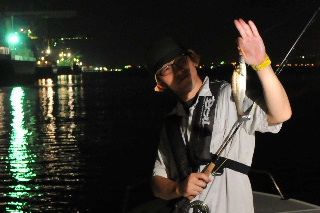 <詳細> 今回の明康丸は、いつもとちょっと違う。 カタログやポスター用の写真撮影をしにきたのだ。 コンパクトのデジタルカメラでは、思ったような画像が得られないため、 一眼レフのデジタルカメラを持ち込む。 自分で自分を撮影することは出来ないため、 本格的に一眼レフのカメラが触れるマンサーと言う事で、 撮影スタッフに天野を加え、いつもの名古屋巷へくり出す。 フライゲームでの写真が主に欲しいとのことなので、 “いかにも”といったロケーションでキャスト&リトリーブをくり返す。 カメラマンの天野からあれこれと指示が入り、身体の向きや、リトリーブのスピードなどを 調整しながらの釣りなので、 実際の釣りとは、トレースコースやリトリーブが程遠い。 しかし、たまにこんなのが元気一杯にフライへアタックしてくる。 ルアーの写真も少し撮ることになり、小川キャプテンからあれこれレクチャーを受ける天野。 キャスティングでのシーバスなんて、何年とやっていない天野だが、 なんとか様になる写真が撮れた。 何枚か納得のいくものが撮れたので、 夜があけはじめて、デーゲームのロケーションの撮影をしに、ポイントへ船を奔らせる。 しかし、撮影には不向きな、御覧の空模様。。。 朝焼けの美しい空をバックに、、、なんてプランを立てていたのだが、 残念ながら叶わず。。。 デイゲームの撮影は、またの機会に持ち越しとなった。 そうなれば、もう普通に釣るしか無い(笑) 最近、名古屋巷デイパターンもずいぶんと開拓して、安定して楽しめるようになってきた。 自分は、フローティングラインの釣りしかしない。 それはなぜかと言うと、ドライフライでの水面炸裂系のゲームが好きなのもあるが、 それ以上に、“沈める必要がない”からだ。 それくらい小川キャプテンの、ポイントセレクトがフィットしていると言う事。 この日も様々なロケーションで、シーバスの上げる水しぶきを堪能。 やはり、デイゲームは楽しい。 キャスティングの正確さが増すのと、場所によっては水中のストラクチャーや、 水深の変化が直に見えるので、 バイトのタイミングが予測しやすい。 ちなみに、今回のバイト数は、ざっと50バイトほど。 夏季の高水温の状況でこれだけのバイト数が稼げるってことは、 ”祭”と言われる秋はどうなっちまうのか?? しかし、こーゆー時にこそ、ポイント開拓の意味はあると思うので、 引き続き検証を続ける。 <タックル> OKAMOTO ■ロッド:G-Loomis GLX-SR #6 ■リール:ダニエルソン LW 4seven ■ライン:3Mシャークスキン トラウトテーパーWF6 ■リーダー:バリバス サーフェイスリーダーFC 1X 12ft ■フライ:フローティングミノー ++++++++++++++++++++++++++++++++++++++++++++++++ ■ロッド:Team MANSAR オリジナル #5 9.0ft ■リール:ダニエルソン Traditional DRY FLY ■ライン:3Mシャークスキン トラウトテーパーWF5 ■リーダー:バリバス サーフェイスリーダーFC 1X 12ft ■フライ:フローティングミノー