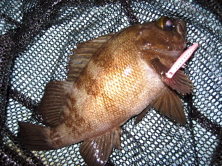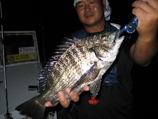 <詳細> 久しぶりの天野丸。 三河湾のメバルは、半袖で釣りが出来るようになってからが本番だ。 エサ釣りの情報を頼りに、船を出す。 まずはじめは、情報どおり、デカ島周りを攻めるが、水の感じが全く良く無い。。。 夜光虫が大量発生しておるうえに、いやな濁りが出ている。 おまけに、水面に細かい泡的なものまで出ていて、ダメっぽい。 しかし、そんな中でも釣れることがあるので、一応やるが、チビカサゴと思われるアタリが 数回あったのみで、まったく生命反応ナシ。 周辺で何度かアンカー入れなおして探るも、状況かわらず。。。 時間もそんなに余裕があるわけではないので、ここで大きくエリアチェンジする。 情報では潮が悪くてダメだと聞いている、チビ島まわりに移る。 時間も時間だし、帰りついでにチラっとみて、帰る。 そのくらいにしか思っていなかったが、チビ島に近付くにつれ、船の引き波が放つ、 夜光虫の発行現象が、あきらかに少なくなってきている。 こりゃイイかもしれん?? 予想は適中。 一ケ所目のアンカーポイントから、バイトが多発する。 しかも、重量感のある、サイズの良さそうなアタリだ。 ワームでなかなか乗らないため、マンサーエースプラグに切り替えて一投目、 あきらかに今までとちがう、ゴツン!というひったくるようなバイト! 柔らかい方のロッドを使っているため、なんども突っ込まれながら、ネットイン。 24cmほどだが、これ以上ないくらいの、グッドコンディションなメバルでした。 そのご、天野もプラグに変えて、ヒットが頻発するようになる。 同サイズのメバルと、30cmほどのセイゴと半々くらい。 そんな中、天野のロッドが大きく曲がる。 下へ下へとガンガン突っ込っみ、まったく上がってこない。 こりゃ間違い無い“アレ”だ。 メバル用の細仕掛けなので、慎重にやりとりしながら、無事ネットイン。 天野丸名物外道、チヌさんでした。 去年の今時分、自分も同じような感じで釣っているので、ちゃんと狙ったら、 そこそこ釣りになるんじゃないだろうか?? と、同じことを去年も言っている。。。 来年こそは、ちゃんと専用タックルで挑もう。 天野丸のホームグラウンドだが、やはり初夏〜梅雨入りくらいが一番面白そうだ。 ちょうど釣りものがひと段落する時季なので、来年からもう少しきちんと取り組んでも よさそうだ。 ま、なにより良いのは、ライバルが皆無ということ。 これにつきる。 <タックル> OKAMOTO ■ロッド:Team MANSAR オリジナル 7.0ft ■リール:イグジスト2506 ■ライン:ヨツアミG-Soul 0.4号 ■リーダー:グランドマックスFX 1.2号 ■ルアー:マンサーエースプラグ他 AMANO ■ロッド:フィネッツァプロトタイプ762UL-S ■リール:イグジスト2506 ■ライン:ヨツアミG-Soul PE0.4号+グランドマックス1.0号 ■ルアー:マンサーエースプラグ他