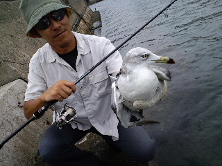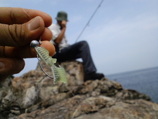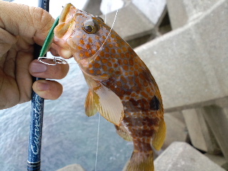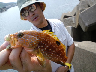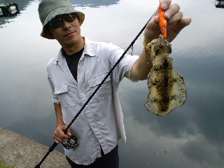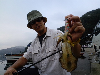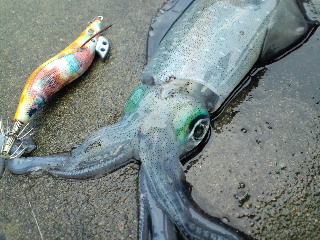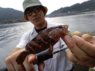 <詳細> 「海が呼んでる…」 今回、久しぶりに岡本君と釣りに行く事になったのは良いタイミングだった。 レポートには書き残していないが、先週は今季好調の琵琶湖方面へ向かったのだか、 激ショボに終わったのだ。 マンサーは毎年この時期になると、ソルトの話題が盛り上がってきて、 僕はやや遅れて、バスからソルトへシフトするのだが、今年はそれが、早めになりそうな予感がする。 まずは、ナイトシーバスへ。 が、これまた激ショボ。チビセイゴすら釣れず、オマケに、ルアーを2個もなくしてしまった。 岡本君もフライに夢を託すも、何も起こらず。 こうなるともう、寝る以外に手だてが無い。 素直に寝る事に。 まぁ、この1日を終えた今思えば、この睡眠時間は良かったと思うが。 「バチバチバチ…」 時々、車を激しく叩く、雨の音に起こされたりしながら朝を迎えた。 次のお目当てはハマチだ。 前回、7月の釣行では、結構反応が良かったので、よもやハズすまい…と、思っていたのだが、 これがサッパリ。 時々、ナブラが見えるのだが、なぜかチェイスすらない。 ご自慢の「テーパーアンドシェイプ・ブルーバレル」が「青い銃砲身」ではなく 「憂鬱な銃砲身」と化した。 岡本君はさっさとエギングロッドに持ち替えているではないか。 どうもワインドにアオリイカが付いて来たらしい。すると、速攻でヒット! ![]() オー!エメラルダス! ![]() その後も、小移動をすると、行く先で大体1投目か、数投目にはイカの反応があるようだ。 ![]() まぁ、エギングも悪くないが、まだサイズも小さそうだし、僕はもう少し季節が過ぎて、 サイズも上がり、知恵も蓄えた頃に釣るとするか…てか、そもそもエギなんて持ってきて無い。 まさか、シーバスも、ハマチも全くダメなんて考えても無かった。 次のポイントへ移動。ここで気合いを入れ直しキャスト!…と、いきたい所だが、 見るからにアオリイカ位しか釣れそうに無い場所なので、僕はテンションダウン。 昼寝を決め込む事に。 しばらく寝ていると、岡本君が戻ってきた。 チビイカ位は釣れたかな?と思いきや 「キジハタがエギに結構バイトしてきたよ」との事。 ほう! キジハタ! 昔一時、根魚にハマっていた頃に憧れたキジハタ! 一応、ワームだの、メタルジグだのも持っているので早速狙ってみる事に。 とはいえ、僕はキジハタも想定外だったので、 とりあえずシーバスや、マゴチを想定して持ってきたワームを試してみる。 岡本君が言うには 「デケェよ!(ワームがね)」との事。 見ると、岡本君のロッドの先には、シミったれた…いや、失礼。 フィネスなワームがリグられている。 一応、キジハタを想定して買ってきたモノのようだ。 お互い、キジハタは狙って釣った事は無いので、とりあえずやってみなきゃ分からない。 キャスト開始… お!きたきたっ!ウヒョ〜!なんと、1投目からヒット!…岡本君にね。 ラオウのように拳がデカくなった岡本君。 ![]() まぁ、サイズは小さいが紛れもなくキジハタである。 こんなにアッサリ釣れるモンなの? たまたまだろうと思ったが、その後も、岡本君のワームにはガンガン食ってくる。 ![]() こりゃ、たまたまではない。 かなり沢山居るようだ。 僕のデカいワームには全くアタらないので「マリア・リトルビット5g」でチビジギングを試すとヒット! ![]() サイズは相変わらずだが、やっと釣りらしくなってきた。 しかし、岡本君のほうが圧倒的に釣れる。 バス用の「ゲーリー・シャッドシェイプワーム」を使っているのだが、まぁ、よく考えたら、 シミったれた…いや、失礼。 フィネスなワームとは言っても、それはバサーの目で見ての事で、 ルアーによる根魚釣りが流行りだした頃に多用されていた 「エコギア・グラスミノーS、SS」辺りに比べればリッパなサイズのルアーだ。 このテールが絶妙なのか? バイトの数は僕の操るチビジグとは比べ物にならない位ある… ![]() でもまぁ、当然、こんな事になったりもするけど。 結局、ここでは岡本君が10匹程、僕が5匹程のキジハタをキャッチ。 憧れの魚を一気に庶民の魚へと引きずり下ろした感がある。 しかし、僕はこれまで、根魚用のワームなんて、口の中に収まるサイズで、 テキトーにプルプルしてて、目立つ色なら何でもOKだと思っていた(ナメすぎ)。 やはり、サイズや、ボリューム、カラーなど、変な先入観を捨て、 色々試さないと分からない事があると反省した(素直でよろしい)。 さて、お次のターゲットは再びシーバス。 完全真っ昼間のシーバッシングだが、ポイントを選び、サイズに贅沢をいわなければ楽しめるハズ…と、 思いきや、チェイスのみでノーバイト。 今回、デイシーバスはかなりアテにしていたのだが…まだ季節が早いのだろうか? もはや、手詰まりである。何かネタは無いものか…考えたすえ出した答えは「再びキジハタ狙い」だ。 確かにそれがカタそうか? まさか、こんな流れになろうとは思わなかった。 まぁ、こういう「何が釣