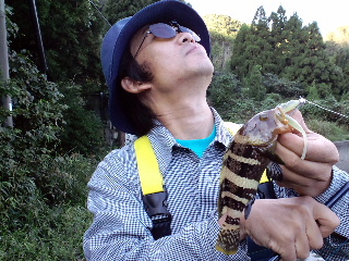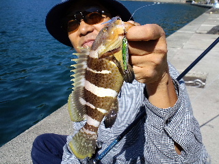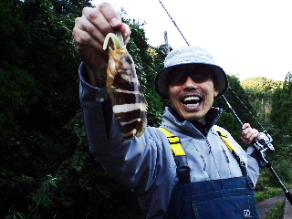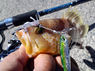 <詳細> 久々の台風上陸の影響が気になる中、これまた久々のテッちゃんと 2人の釣行。 思えば、7年前に「YF川」にゴムボートを浮か べて以来だ。 すでにオフシーズンに入った、渓流のフライを本職と するテッちゃんだが、 これを機に、今まさにチームマンサー内に吹 き荒れる「根魚台風」の真っ只中に飛び込もうと言うのか? うかう かしてると飛ばされちゃうゼ(何が?)。 途中、サルの軍団が行く手を阻む。 ![]() ヤツらにとって僕らは「招かれザル客」なのか? が、今さら後に退 けるハズもない。 まずは前回の、岡本君と天野君との釣行でも朝イ チに入った、通称「アオハタ牧場」へ。 今の時期、福井県で根魚と 言うと、何と言っても「キジハタ」が有名だろうが、 ポイントに よっては、「アオハタ」がメインになるのだ。 コイツは意外と話題 にならないが、チーム・マンサーでは基本、釣り方も変わらない し、 どちらも釣れればOK。同等の扱いだ。 キャスト開始早々にバイト!ノらなかったが、今日は台風の影響が 気になっていたので、 この愛想の良さは嬉しいモノだ。 そして、小移動をするうちにヒット! これがアオハタだ! ![]() 間違えた…こ、これがアオハタだっ! ![]() 名前と違い、青くはなく、むしろ黄色い。しかし、改めて根魚とい うのは良い引きをする。 特にハタ系の魚を掛けると、まず引きの強 さに驚かされ、上げてくると、 意外な小ささにまた驚かされるの だ。思わず 「まったく、ROCKFISHってヤツはROCK‘N’ROLLFISH だぜ!」 と叫んでしまった(ウソつけ)。 そして「スピニングリールなんて久しぶり」と言っていたテッちゃ んにもヒット! ![]() 「ニモだ!ファインディングニモだ!」と、楽しそう。一安心した 所で、僕にもヒット!。 ![]() うん。前回よりはバイトは少ないが、このぶんならイケそうか? が、期待に反して、移動しながら撃ちまくるが、どんどん反応が ショボくなる。 前回も反応がある場所と、無い場所の差は大きかっ たが、それがより激しくなった感じだ。 結局、最初の場所が一番良 かったので、戻るついでに軽く、再びサオを出しポイント移動。 しかし何だろう?朝からずっと、浅い所で、何かがエサを追って 「ガバッ!ガバッ!」と、やっている。 恐らくシーバスと思われる が、前回は見られなかったし、 これも台風が何らかの影響を与えた のだろうか?が、ジグにも、ワームにも無反応。 次のポイントは、遠投が必要なのでメタルジグをキャスト。 ある程度ウェイトの有るメタルジグをブン投げるのは実に気持ち良 い。 どちらかと言うと、地味に成り勝ちな根魚の釣りを、軽快でス ポーティーなモノにしてくれる。 これで魚が釣れれば文句無いのだ が…(そりゃ困ったね)。 全然釣れない訳ではないのだが、やはり前回とは比べモノにならな い。またポイントを移動。 通称「福井SD」へやってきた。ここもまさにジグ場。ブン投げ て、ブチ沈めて誘いをかける。 するとようやく、少しまともサイズのアオハタがヒット! ![]() 最近、チーム・マンサーで流行の「ラバー巻きフロントフック」だ。 ![]() フライマンは、こういうのはお手の物だが、フライはノータッチの 僕には簡単ではない。 これまでは岡本君の作ったヤツをもらってい たが、岡本君から巻き方を教わり、 ある方からバイスを頂き、これ からは自分でも作ってみるつもりだ。バスが基本の僕は、 これまで スピナーベイト、バズベイトのスカートを巻くのは「人間バイス」 で行っていたが ![]() さすがに小物を作るには限界を感じる(クサそ)。 やはりテッちゃんも、フライマンだけに、岡本君とは、形は多少ち がえど、きっちり作ってきていた。 それだけに尚更、このタフコン ディションが悔やまれる。 もう少し早く来ていれば…てか、テッ ちゃんとたまに釣りに来ると、 しょっちゅうこのセリフがでる気が する…。 さすがに今回、アオハタオンリーはキビしいかも…と、シーバス狙 いに切り替え、 いつものシーバスポイントへ。台風による濁りが薄 れつつある状況だし、 かなり期待したがノーキャッチ。 バイトかな?ゴミかな?というような感触はあったのだが…(ゴミ でしょ?)。 最後の手段で「マンサー・オフィシャル何でもポイント」へやって きた。 僕はハマチングに活路を見いだすべく「ワインド釣方」に賭 けてみた。 テッちゃんは…どうやら夢の世界に活路を見いだ すべく眠りに入ったようだ。 ブン投げて、ガンガンシャクるが、全く反応は無い。 元々、眠いと ころに無反応では、こういう体育会系の釣りに必要なテンションが 続かない。 疲れたので、僕も車に戻り、夢の波間へ飛び込む事に。 ふと、目が覚めて、車の中でボーっとしていると、 イカツいグラサ ンをした男が僕の車に近づいていて来る…な、何さ?も、文句でも あるのっ? …と、よく見れば水野君ではないか!偶然にも、今日は 家族で釣りに来ていたようだ。 お互い、ここまでのショボい結果報告をしあい、水野君はエギング をやる事