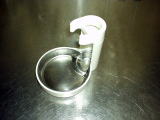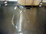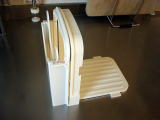 コレは多分私くらいしか買わないでしょう(笑)。主に餃子を作るときに使います。作ったそばからこの盆に載せ、すぐに冷凍するのです。分かり難いけどこれ、実は3枚重ねてあります。使うときは、4スミにあるブツを乗せることで重ねて使えます。実はこのブツ、紙コップを高さを合わせて切ったものです。冷凍庫のサイズにあわせて買いました。1枚800円くらいだったかな。近所の金物屋さんで。アルミ製です。でもね、これのお陰で餃子を作りやすくなったのよ♪鍋蓋置き