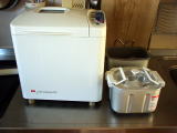我が家のパン焼き器。買って5年目になります。元は取り巻くっています(笑)。我が家のはリーガル製で、ジャムも作れる、そしてアイスも作れます(右手前の容器を使う)。アイスが作れるものとなるとどうしてもお値段が張るらしいです(かみゅさんによると2〜3万するらしい)。パン焼き機能だけなら今だと数千円で買えるようになりました。普通に食パンを焼くだけならちっとも難しくもめんどくさくもありません。焼き立てはホントに美味い!私はカタログ通販で購入。製パン用布(正式名称は分かりましぇん♪)