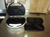私のは安売りでスーパーの安売りで4000円くらいで見つけました。写真で本体に取り付けているのが焼きおにぎり用。右手前がホットサンド、右奥がワッフル用です。もともとホットサンド専用のを持ってたんだけど、どうしても焼きおにぎりを作りたくて買い換えました。ホットサンドは、ハウスでレタスが出来る夏に良く使います。焼きおにぎりは今時期。要領をつかむまでちょっと難しかったけど、何回かやってればすぐ慣れる。お手軽に出来ますよ。もう少しムスメその1が大きくなったら、一緒にワッフルを作る予定♪食パンカッター