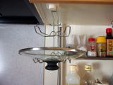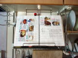 鍋をを使っていて、蓋の置き場に困りませんか?私はいつも下置こうとする時に手にあたって「アチチチチッ」ってな事になってイヤでした。しかも、ただでさえ狭い台所で結構場所とるし。これは便利です。新婚当初に買ったから値段は覚えてないなあ。吊り戸棚に留め具はさむタイプ。カタログ通販です。レシピスタンド