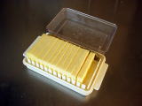 最近ネット通販(スタンダード・キッチン)にて購入。多分700円くらい。手前に並んでいる白い片のガイドガイド通りに、バターを最初から切っておくと1目盛が大さじ1(15g)の分量になっています。バターを乗せてある台には3分割のガイドがあって、それにあわせると、5gになり、トーストに塗る分量としては丁度いいそうです(我が家は焼きたてパンをむしって食うので使いません)。お菓子を作る人、パンを作る人は、是非買いましょう。計り不要です!ご飯を温める器(正式名称わかりましぇん)