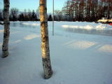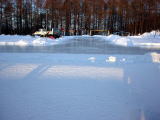 割と有名な話ですが、北海道の学校での体育の授業内容はちょっと特殊です。まず、学校にプールがあるというところはほとんどなく、年に1,2回、公営プールにて講習がある程度。その影響か、ほとんどの道民は泳げません。ちなみに海は冷たいので、あんなトコでは泳げません(笑)。道南の方では泳げるのかも知れないけど。「おたるドリームビーチ」というのも有名ですが、少しでも寒い夏は、海の家も開店休業状態です。一方冬になるとスケートをやります。ほとんどの場合スピードスケートですのでクルクル回りません(爆)。これ、リンクを造るのはPTAの役目でして、その時期になると夜に震えながら学校へ赴き、水を撒くのです(想像するだに寒いっ)。私も3年後にはやらなきゃならんのか…(だんなに行かせよっと)。で、冬の間に1,2回スキー講習もあるそうです。但し、山側の小学校ではスケートの代わりに「歩くスキー」をやるところもあるそうですよ。下の写真は小学校のスケートリンク。PTAの方々の手作りです。暗くてごめんちゃい。もうちょっといいのが撮れたらアップします(一応私は学校から見れば部外者だから、中には入り難いのよ〜(涙)。