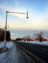 北海道の信号機は、縦型です。歩行者用の赤と青のヤツじゃないですよ、赤・青・黄と3つ並んだ車道用の信号機です。私は別になんとも思ってなかったんですが、ちゃんと意味があるんだそうですよ。ようするに、雪が積もりにくいように、という事なのです。にゃるほりょ♪(↓写真左。暗いけど)