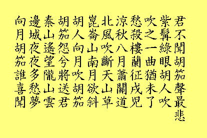 唐の岑参の作。唐朝の忠臣・顔真卿が監察御史として河西隴右に赴く際の送別の宴で詠まれたもの。胡笳の哀切極まりない響きを描写することにより、別れの哀しさがいや増し、何とも言えぬ哀しみが心に染み入ってくる。