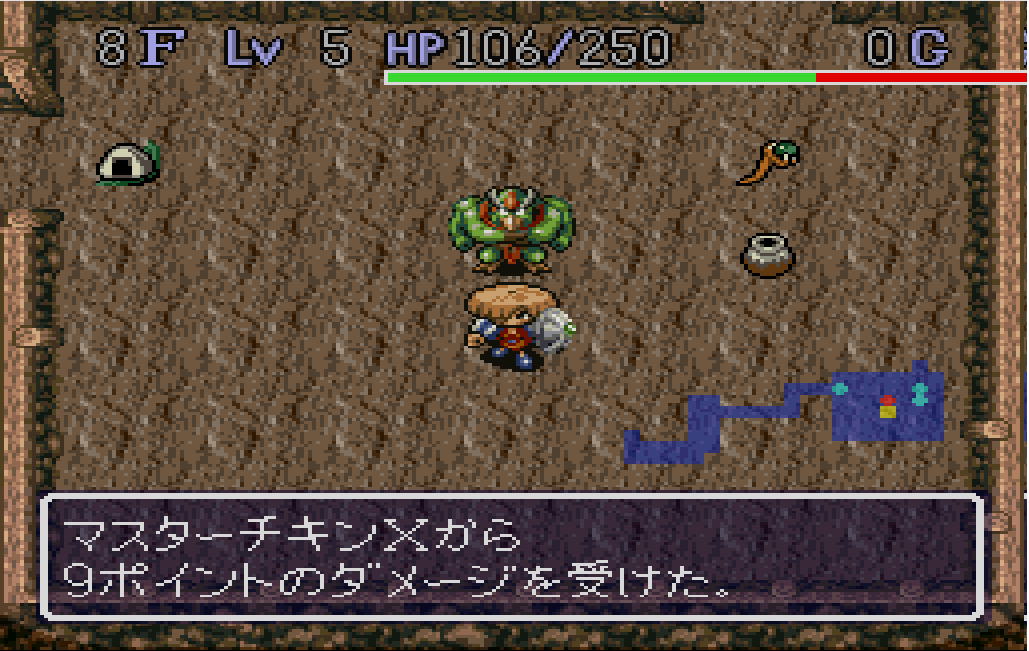 通常速度、ステータスはグレートチキンとほぼ同じです。(攻撃力は255、経験値は1000でした) どうやらマスターチキンの一つ前のレベルのようです。 盾は50の強さです。盾なしだと250喰らいます。 マスターチキンX(没)→マスターチキン→グレートチキン こいつ、やはりHPが少なくなると、チキンにレベルダウンして逃げていきます。