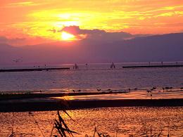 車を置いて、湖畔までデジカメと三脚を担いで歩いて行き、夕日を写真に収めました。