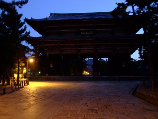 東大寺南大門。うす暗い中で見る金剛力士たちは大変不気味で、普段より更に大きく、そして恐ろしささえ感じました。そして日中以上に重い「気」を発して、見る者を圧倒しているように見えます。空気は澄んでいるのですが、逆にそれが張りつめた緊張感を生んでいるようにも思えるこの空間。