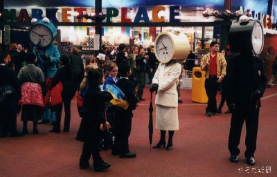 時計男、時計レディーがいました。それぞれ胸に国旗をつけていて時差を表現していますが、