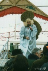 (右)大通り横の特設ステージでは天使に扮した司会者が各種のアトラクションを盛り上げる。
