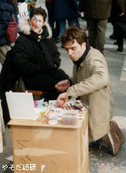 (左)フェイス・メイクをしてもらっている人。 (右)「ニンジン」。お金をかけなくても人生を自分なりに楽しんでいる人を見ると、こういう 人がいる限り、人類の未来は明るいと思います。